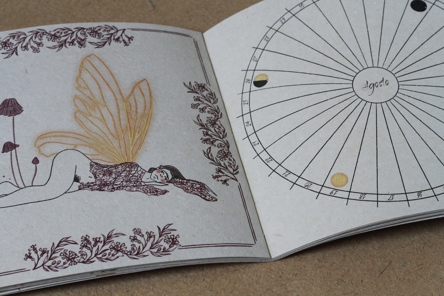 Libreta para el seguimiento del ciclo menstrual con diagramas lunares, ilustraciones y poemas de An Rucó, diseñada para apoyar tu proceso de autoconocimiento y sanación.